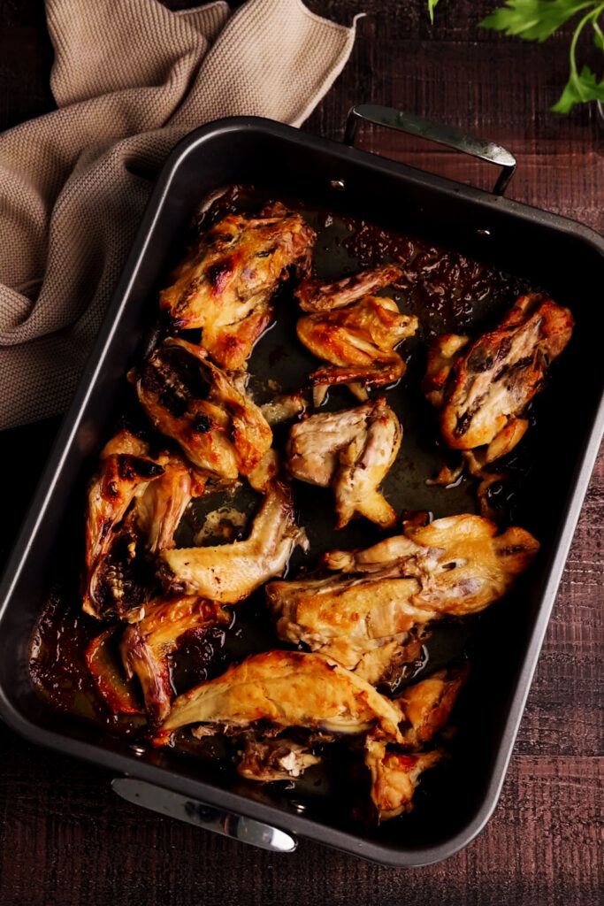 - Roast until deeply golden. Don’t rush this step. Deep browning is what gives the stock its flavour and colour.