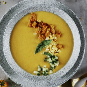 Sunshine in a bowl, this golden gazpacho takes the classic chilled Andalusian Spanish soup in a brighter direction. Sweet raw corn and smoky roasted yellow pepper add depth to juicy yellow tomatoes, while a splash of sherry vinegar keeps it lively. Blended until silky, strained for smoothness, and finished with a drizzle of olive oil, it’s the ultimate make-ahead summer soup. Serve with a handful of garnishes—reserved corn, cucumber, herbs, and crunchy croutons—so everyone can dress their own bowl.